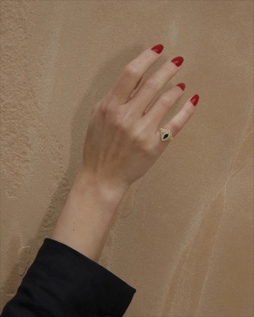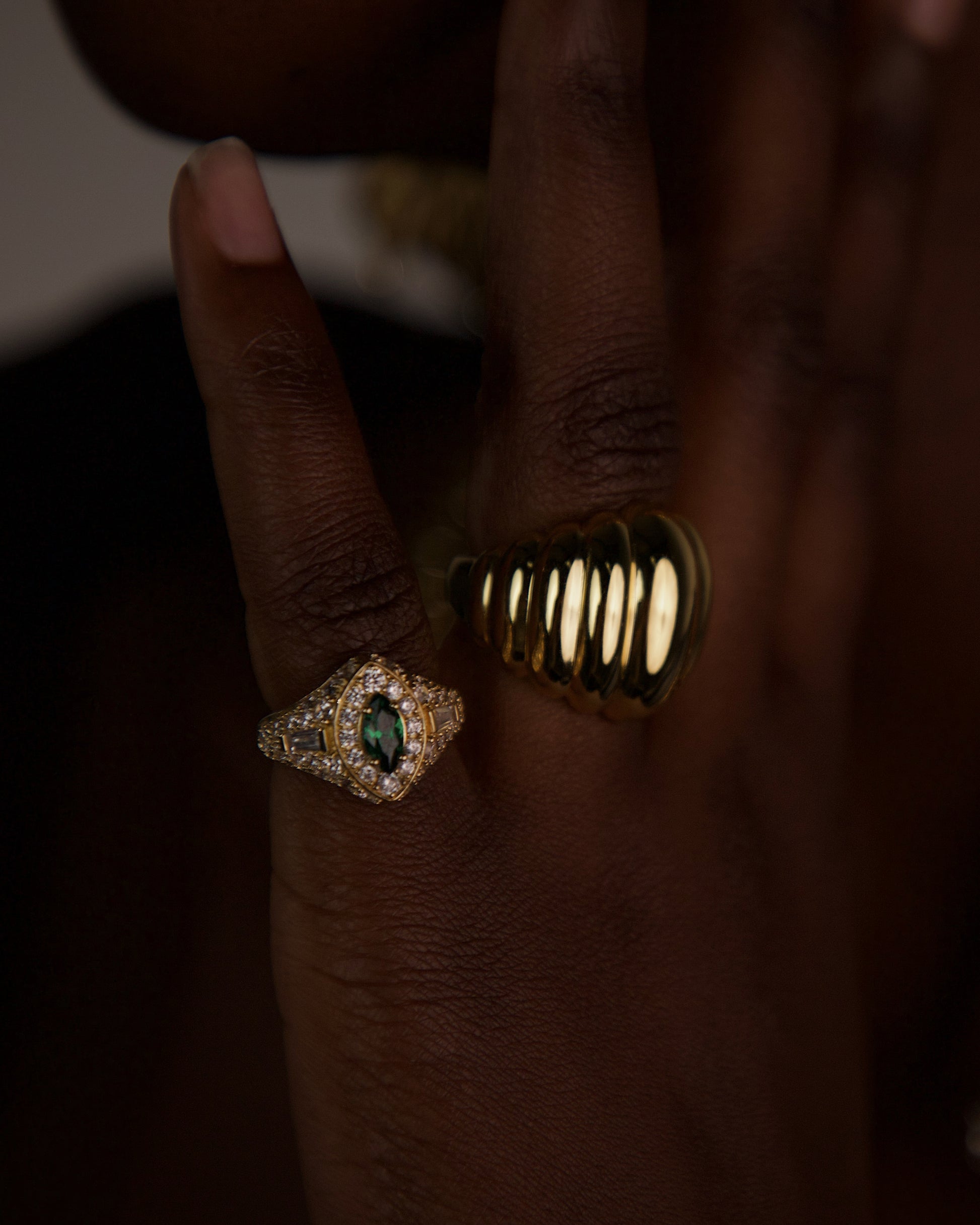 也許是你所擁有過、最具智慧氣息的一枚珠寶。Halo 小指戒展現純正的 Art Deco 設計語彙,鑲嵌亮白色密鑲水晶、白色長方切割水晶,以及祖母綠色馬眼形 CZ 鋯石。