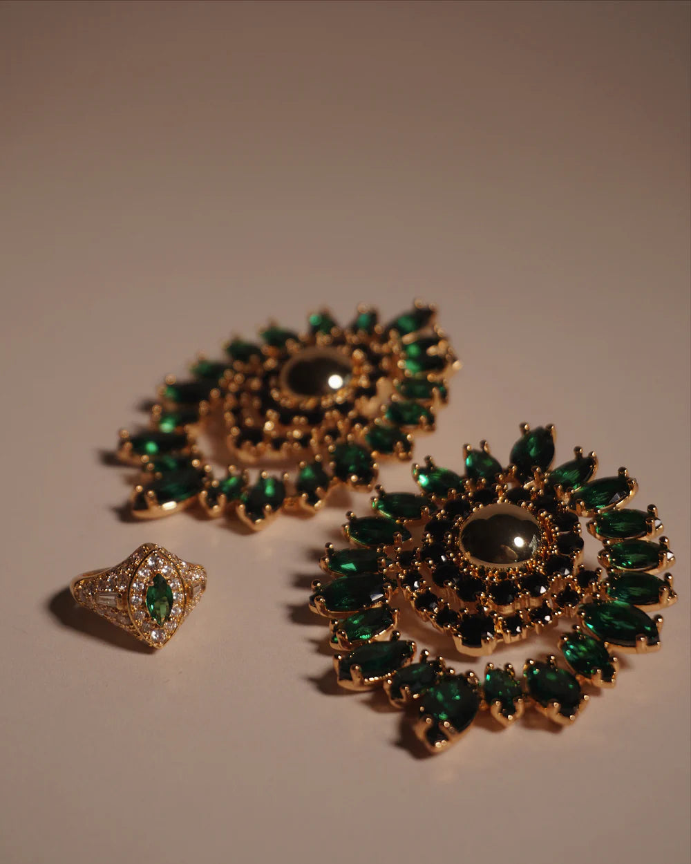 Quite possibly, the wisest piece of jewelry you'll ever own. The Halo Pinky Ring showcases true Art Deco design elements featuring bright white pave crystals, white baguettes and emerald green marquise cz stones.